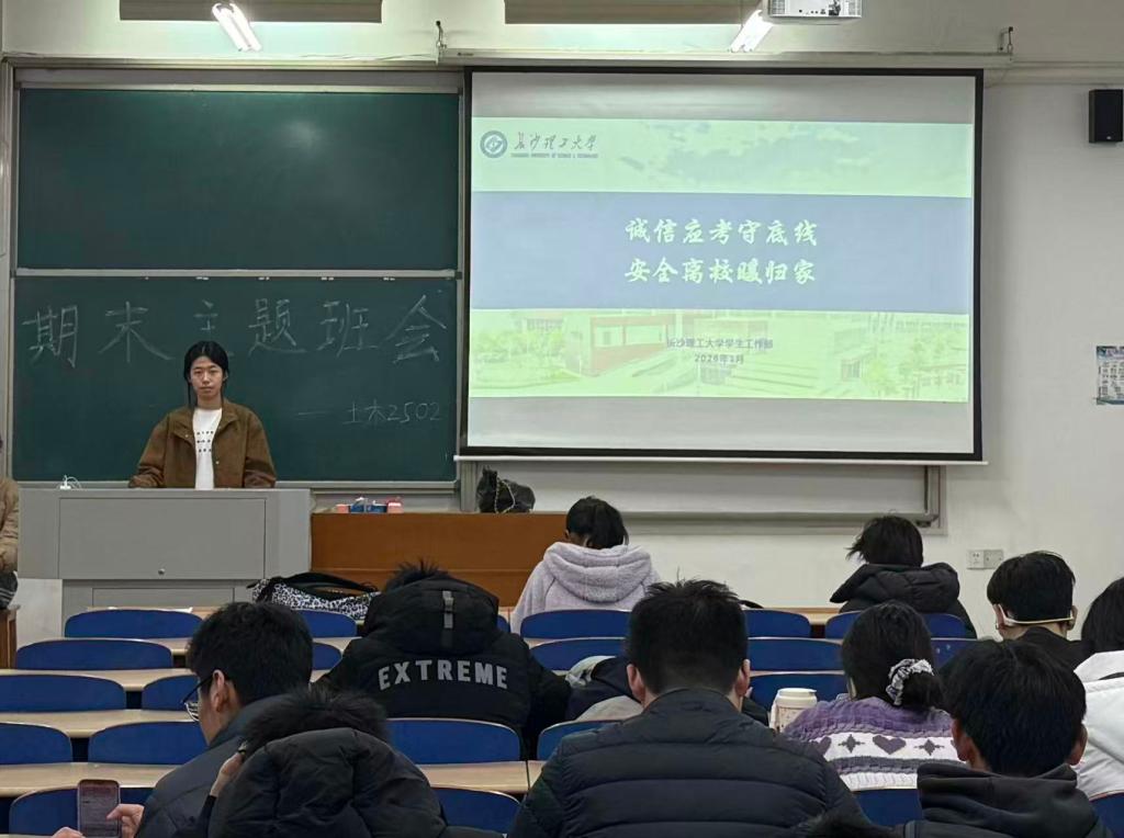 本次班会的核心内容为考风考纪和诚信应考教育、期末安全教育、期末人文关怀与精准帮扶共三个方面。各班级组织学生系统地学习了《在线买世界杯平台学生考试违规处理办法》等文件,结合典型案例剖析违规后果并以班级为单位完成了《诚信考试承诺书》签署;围绕消防、反诈、校园交通等安全要点,通过视频学习、案例讲解开展专题教育,明确离校报备流程与返乡安全要求;同时班长针对学业压力、经济困难等问题讲解了心理健康支持渠道与特困补助申请方式。