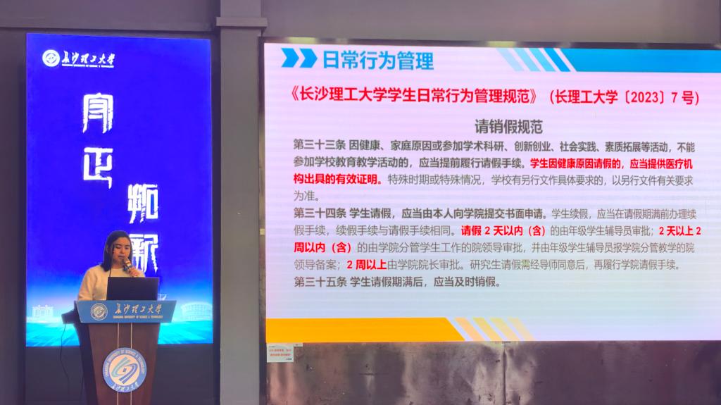 会议伊始,年级辅导员张雅雯结合《在线买世界杯平台学生手册》相关规定,围绕日常管理与安全教育展开讲解。她重点解读了请销假制度、违纪处理办法、校外实习安全管理规定及走读外宿审批流程,提醒同学们毕业季纪律要求不能放松。针对近期高发的“代做毕业设计、论文”类骗局,她结合真实案例进行警示,要求大家增强防范意识,确保人身财产安全。