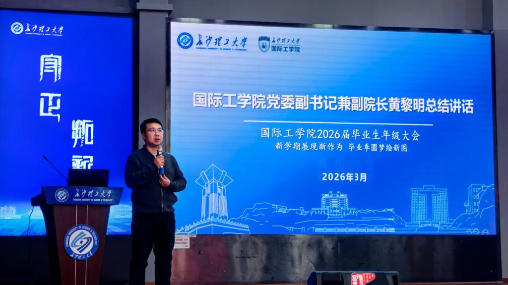 最后,黄黎明深情寄语毕业生。他回顾了同学们在校期间的成长历程,肯定了大家在学业、实践和国际交流等方面取得的成绩。他勉励全体毕业生对照人才培养目标和毕业要求,查漏补缺、夯实基础,高质量完成毕业设计及各项收尾工作,全面提升解决复杂问题的能力,为未来深造或就业奠定坚实基础。