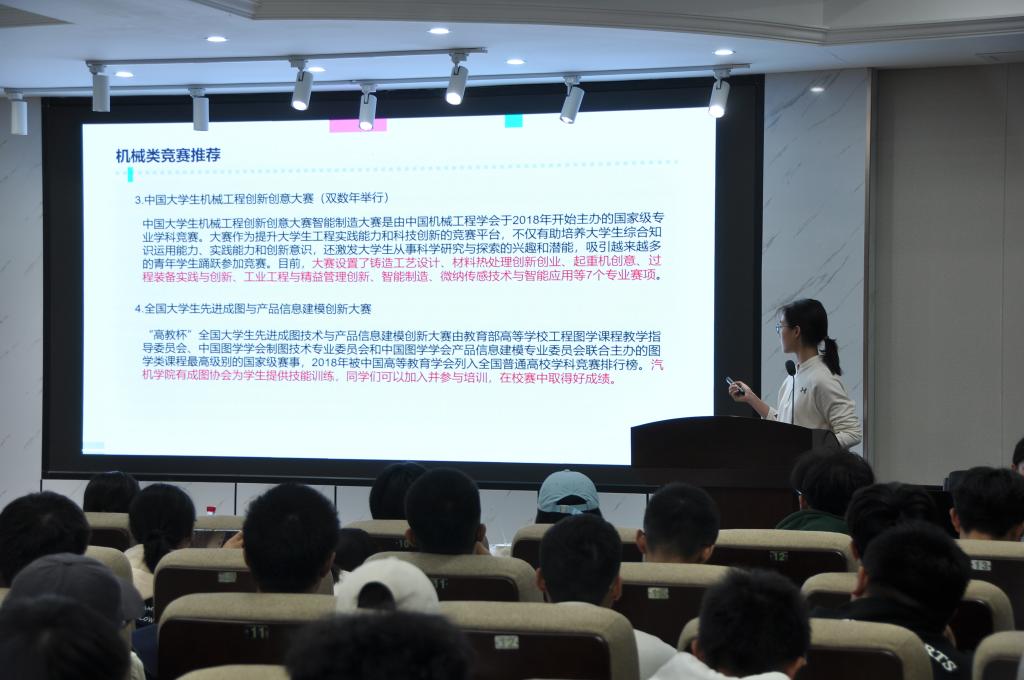 宣讲会伊始,易图科技负责人覃佳颖向新生们系统地介绍了易图科技团队的创立初衷、团队愿景以及所拥有的丰厚竞赛资源。随后,机械专业队长尹淑涵、土木专业队长刘焘玮、电气专业队长陈骕结合自身的参赛经历,分别就各专业领域内重点赛事的基本情况、备赛要点、技术难点、团队协作等重要方面,进行了全面详细的分享。互动环节中,同学们踊跃提问,主讲团队细致解答,现场气氛热烈活跃。最后,学习与发展中心黄文卫老师总结指出,竞赛是深化专业学习的重要抓手,是提升综合能力的重要渠道,她勉励同学们以赛促学,夯实专业基础,实现自我突破。