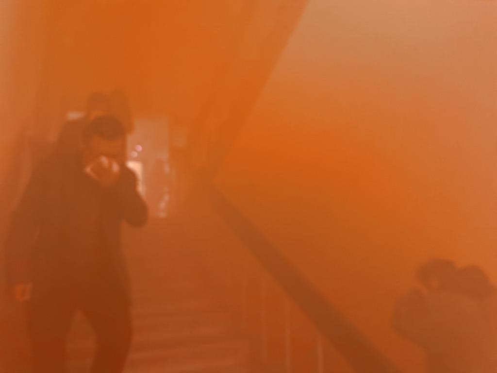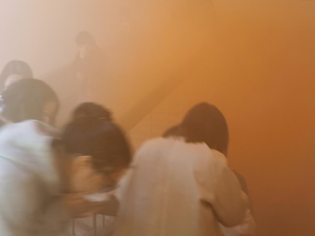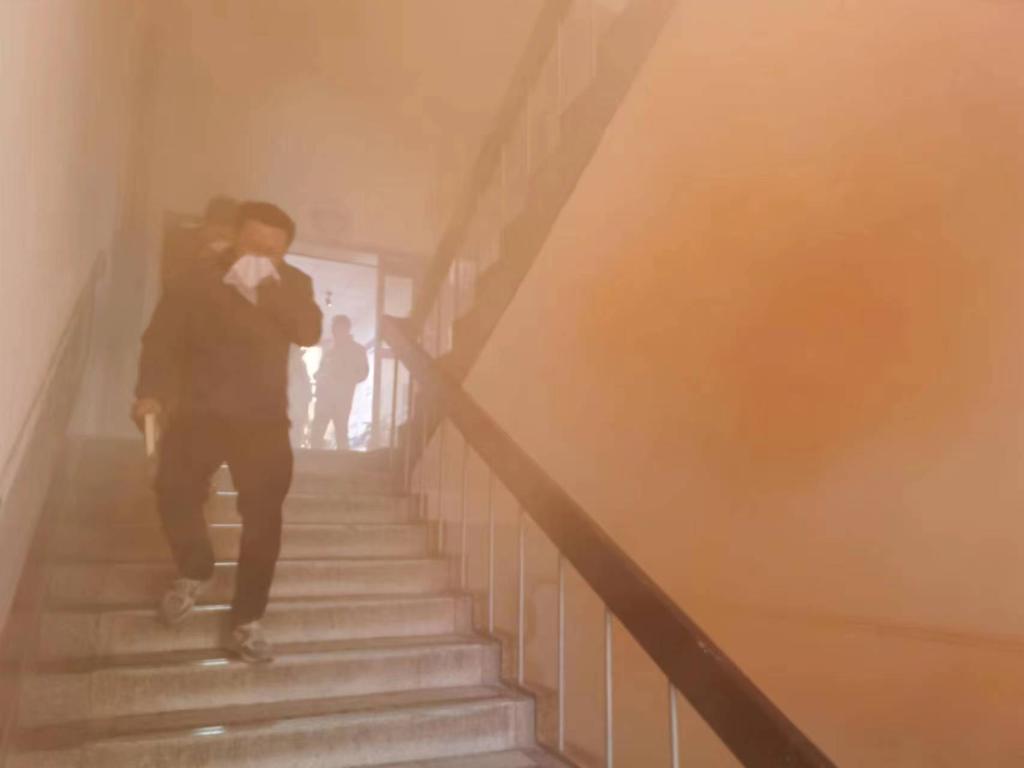 在逃生疏散演练时,随着烟雾弹喷出的股股浓烟,安全员拉响了消防警报,并大声呼喊“着火啦,大家尽快撤离  ……  ”,员工们按照培训时学习的逃生方式,迅速用湿毛巾或衣袖捂住口鼻,弯腰低姿有序沿着消防通道、消防楼梯快速地撤离了“着火”的办公大楼,抵达安全区域。安全员在组织大家紧急疏散的同时,按照发生火灾的应急处置预案,第一时间“拨打”了119电话报警,并向学校保卫部报告。