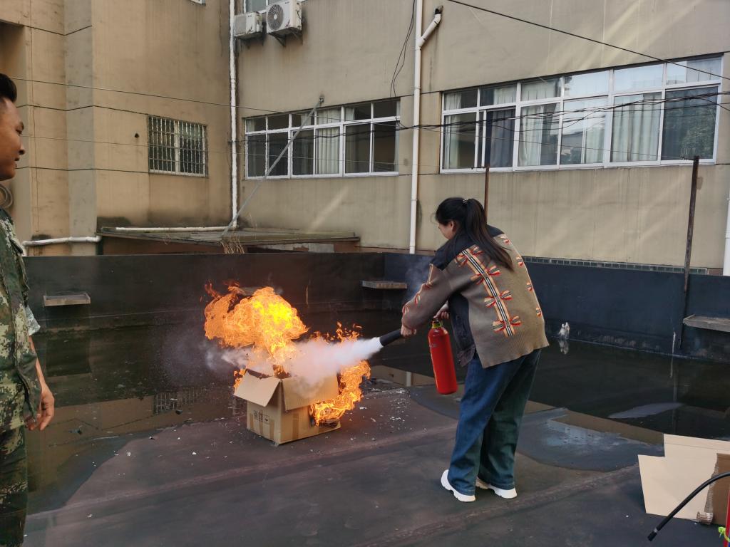 在现场灭火演练环节,面对一个小纸箱燃烧出的“熊熊大火”, 员工们争先恐后抄起灭火器,亲身体验灭火器的正确使用方法,并感受了不同灭火器的灭火效果。