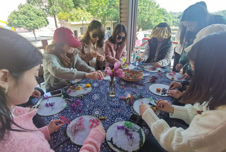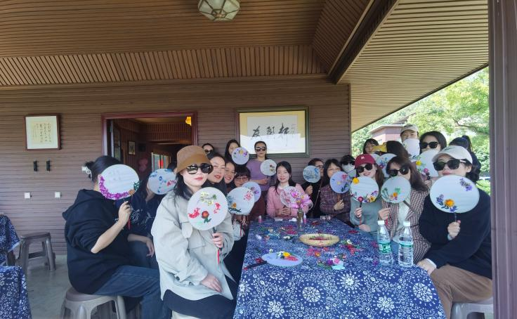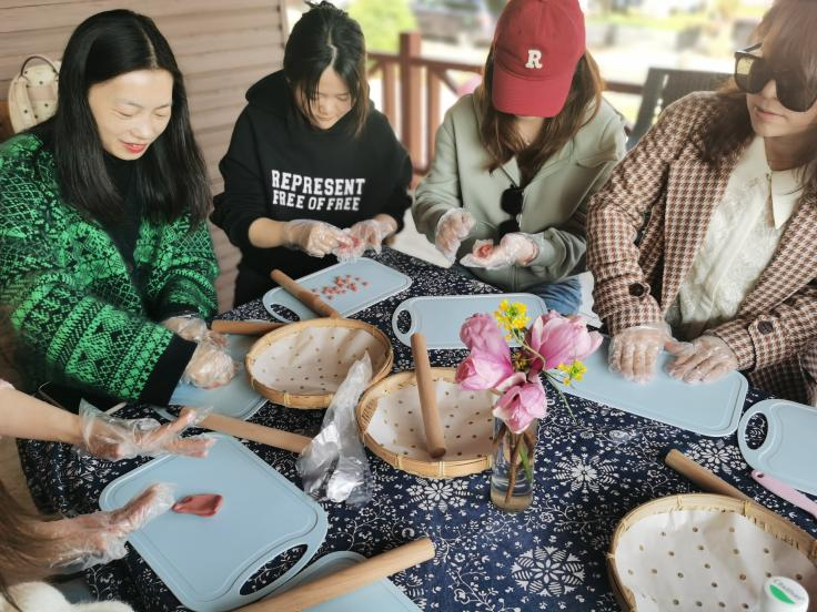 一笺心语,浅浅低吟,活动签到时大家在精美的书签上写下各自的心愿,借一缕春风抒怀。随后,在手工老师的指导下,女神们亲自动手完成了揉面醒面、擀皮包馅、造型修饰等复杂工序,经过高温烘焙,一个个香甜诱人的桃花酥让人眼前一亮,直击味蕾。紧接着开始学习制作团扇,大家巧手慧心,从选材设计、布局造型到色彩搭配,尽情地发挥着自己的想象和创意,将中国的传统文化团扇与代表永恒的永生花相结合,展现古典与传统文化的美。经过一个多小时的努力,干花、绿叶在团扇上展现出它们独特的风采,原本空白单调的团扇瞬间花团锦簇,尽显古典雅致之美。