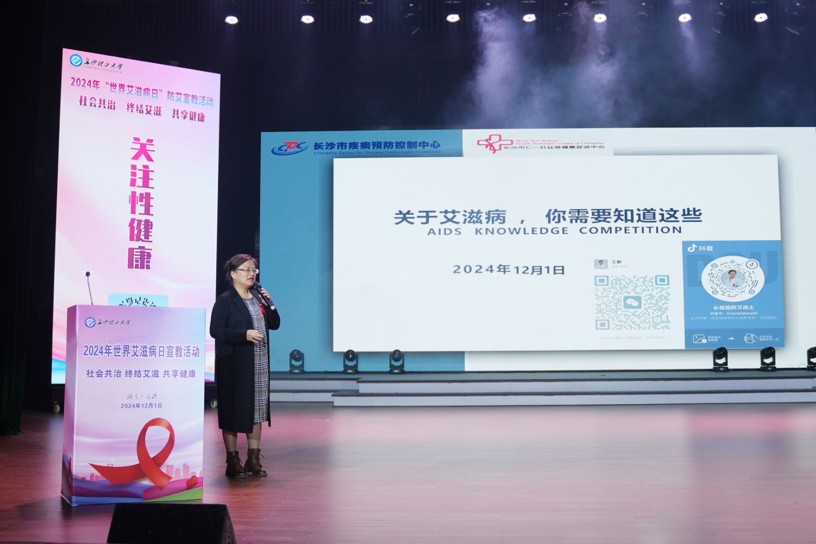 天心区疾控中心主任兰泽龙、长沙市第一医院艾滋病研究所王敏教授分别从艾滋病的危害、大学生艾滋病发病现状及如何做好校园艾滋病防治工作等方面进行了精彩讲解。有奖问答环节,专家们一一为同学们解疑答惑,通过互动的方式引导大家自觉养成健康的生活方式。