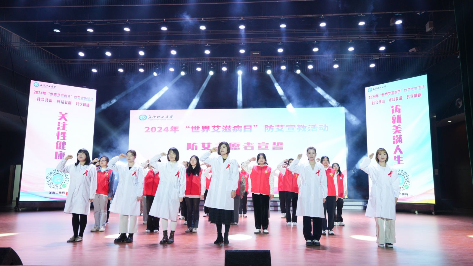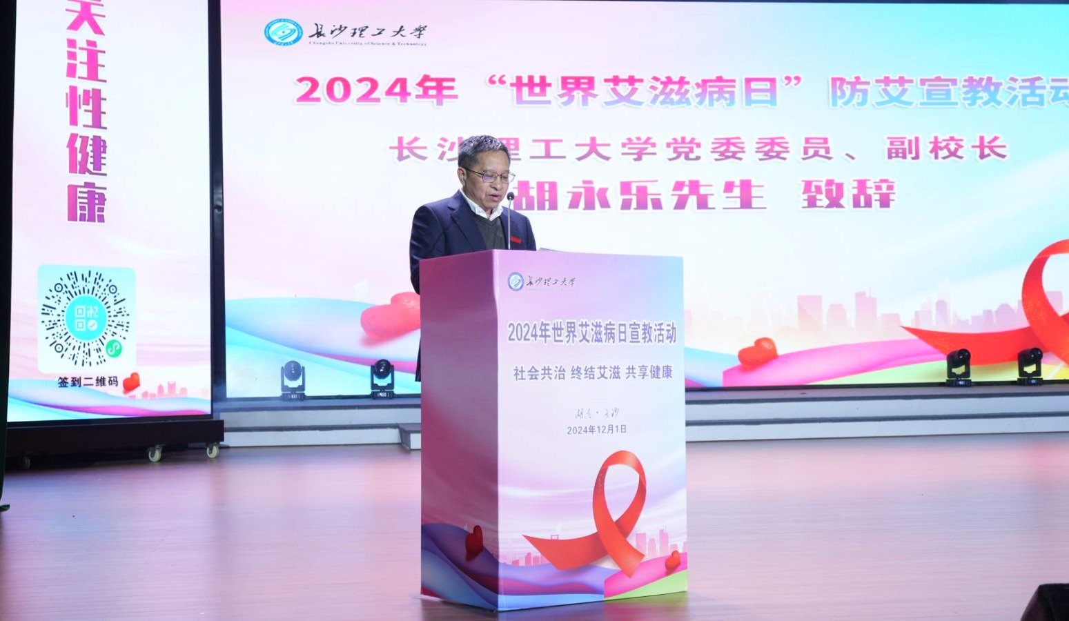 为积极响应国家关于加强艾滋病防治工作的号召,促进健康校园建设,12月1日19:00,世界杯官网联合长沙市疾控、天心区疾控、长沙市仁一红丝带健康促进中心、天心区妇幼保健所,在云塘校区大会堂开展“关注性健康,铸就美满人生”主题防艾宣教活动。校党委委员、副校长胡永乐,各相关部门负责人,天心区疾控、天心区妇幼保健所主管领导,千余名师生代表参加了本次活动。