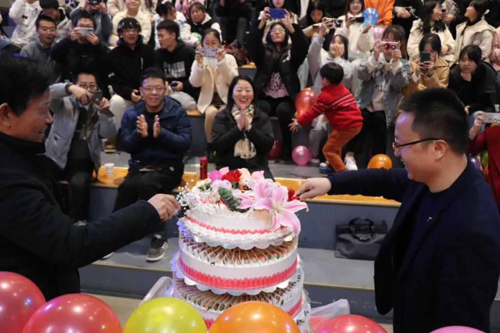 在轻柔的音乐声中,新生代表通过诗歌朗诵表达了入学百天以来的心声,并带领全体新生宣誓:将牢记校训,努力学习,成人成才!各班代表向班主任老师鲜花,向恩师表达感谢。班主任蔡红革老师说:“明年9月,我在有机化学课堂等你们,一个都不能少!”。学院精心准备的四层百日蛋糕上,写上了188个新同学的名字。新生代表吹灭百日蜡烛,老师们齐切百日蛋糕,分发到每位同学手里。化工2106班的李晓鹏感叹:“这次百日仪式更坚定了我所要走的路,去看更远的风景。在大学里不断打磨自己,不负韶华!”