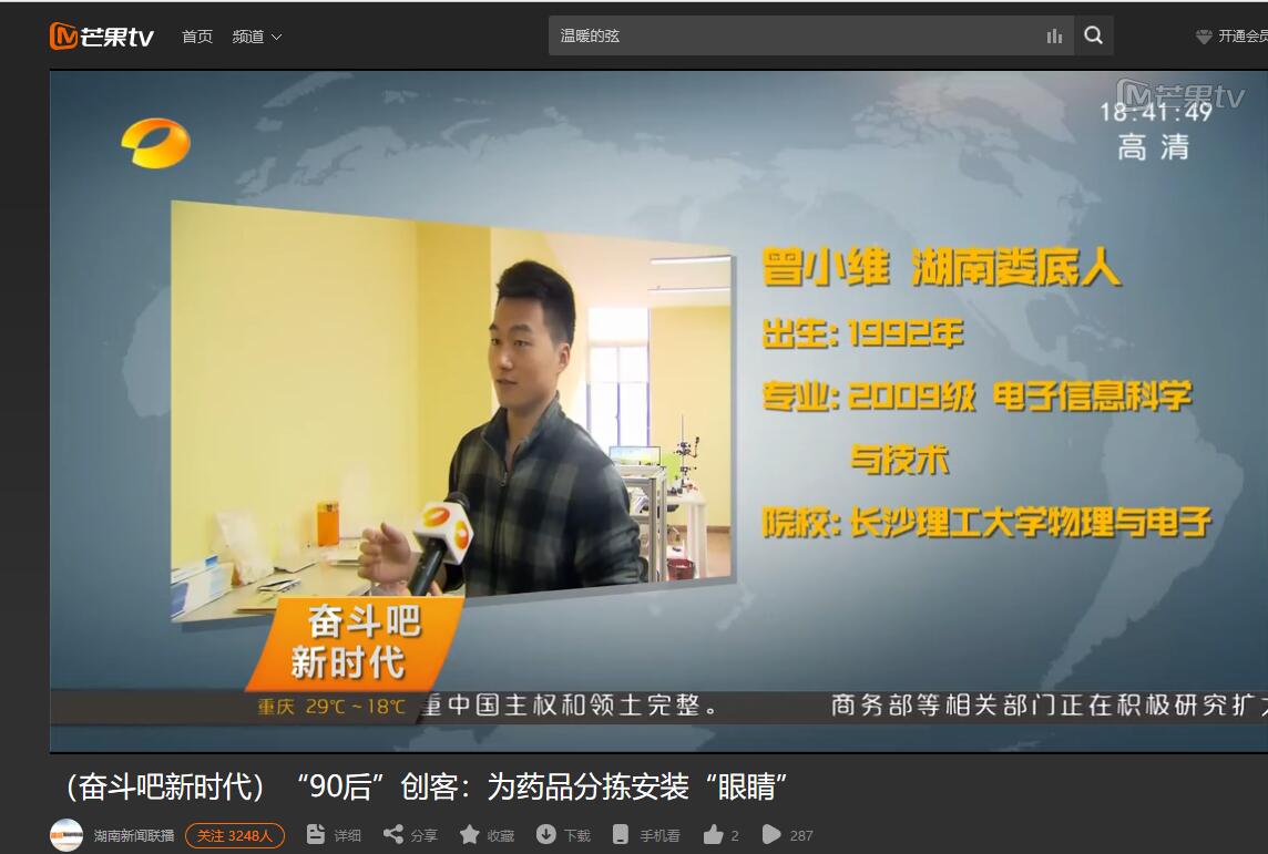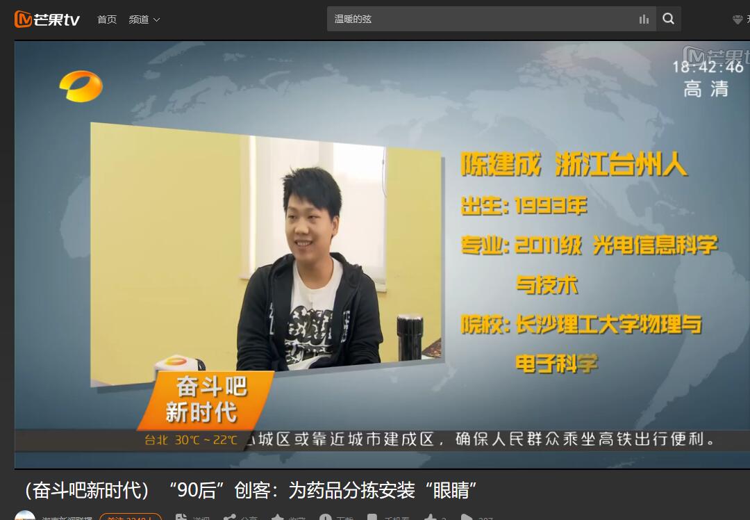 湖南卫视2018年5月8日新闻联播,报道了在线买世界杯平台物理与电子科学学院3名毕业生的创新创业故事,曾小维、刘浪和陈建成分别是在线买世界杯平台13、14、15届毕业生。大学期间,他们都是学院创新团队成员,曾获全国大学生电子设计大赛一等奖。2016年,开始借助机器视觉技术开发出计数和检验系统,能高精度、高速度完成散装产品(药片或胶囊)的外观合格检测和产品计数,技术填补了国内市场空白。