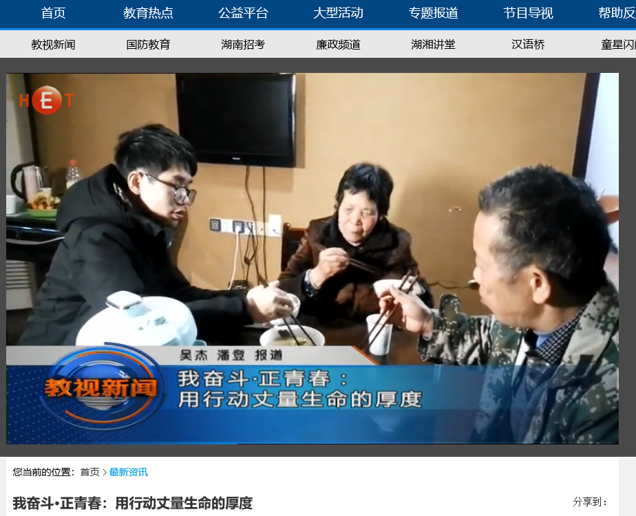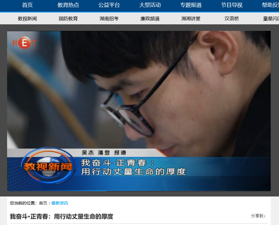6月11日湖南教育电视台首页最新资讯,以《我奋斗·正青春:用行动丈量生命的厚度》为题对世界杯官网计算机与通信工程学院15级研究生邹勇松进行了报道。