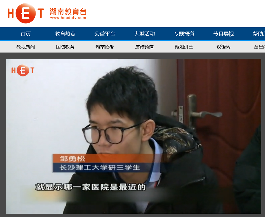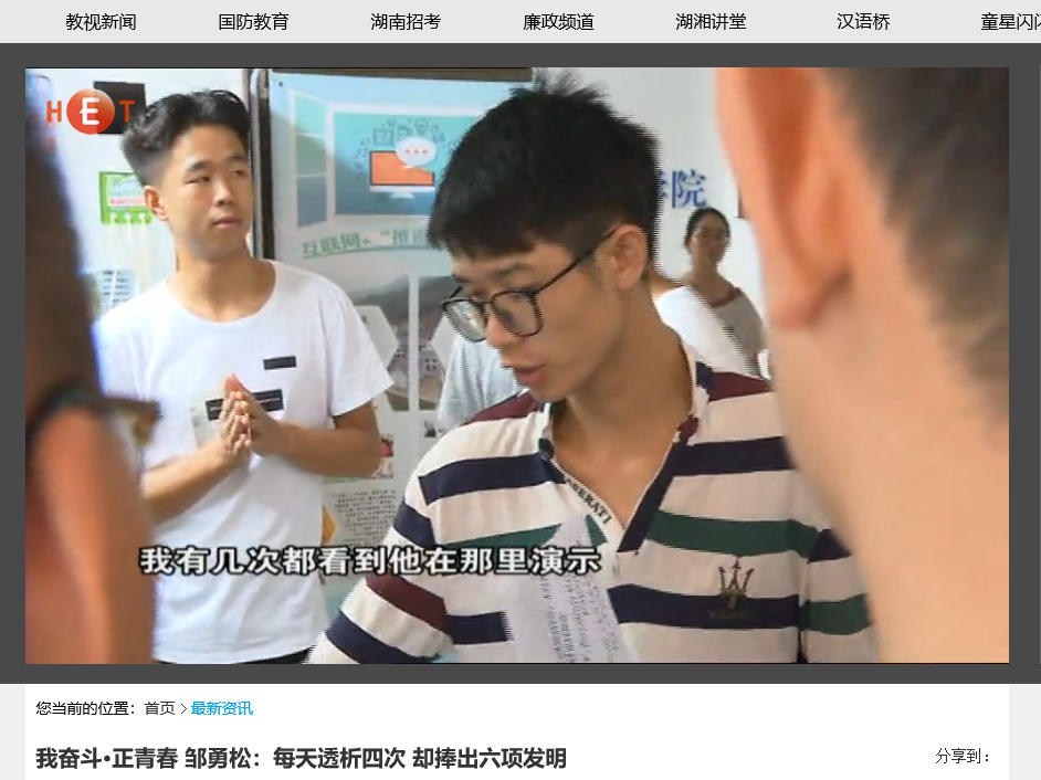 6月9日湖南教育电视台首页最新资讯,以《我奋斗 正青春 邹勇松:每天透析四次,却捧出六项发明》为题对世界杯官网计算机与通信工程学院15级研究生邹勇松进行了报道。