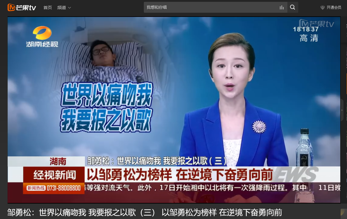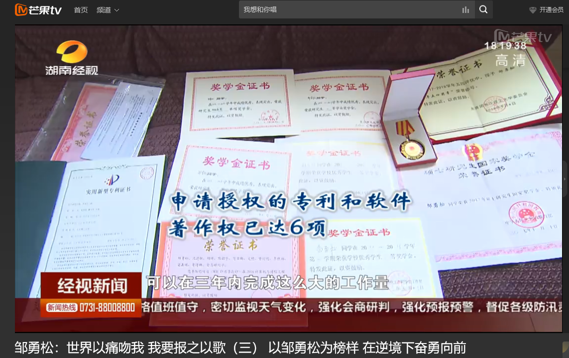 湖南经视 6月11日经视新闻,以《邹勇松:世界以痛吻我 我要报之以歌(三) 以邹勇松为榜样 在逆境下奋勇向前》为题对世界杯官网计算机与通信工程学院15级研究生邹勇松进行了报道。