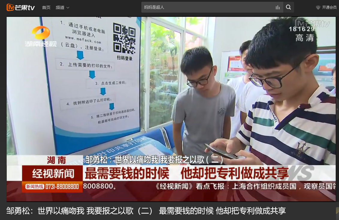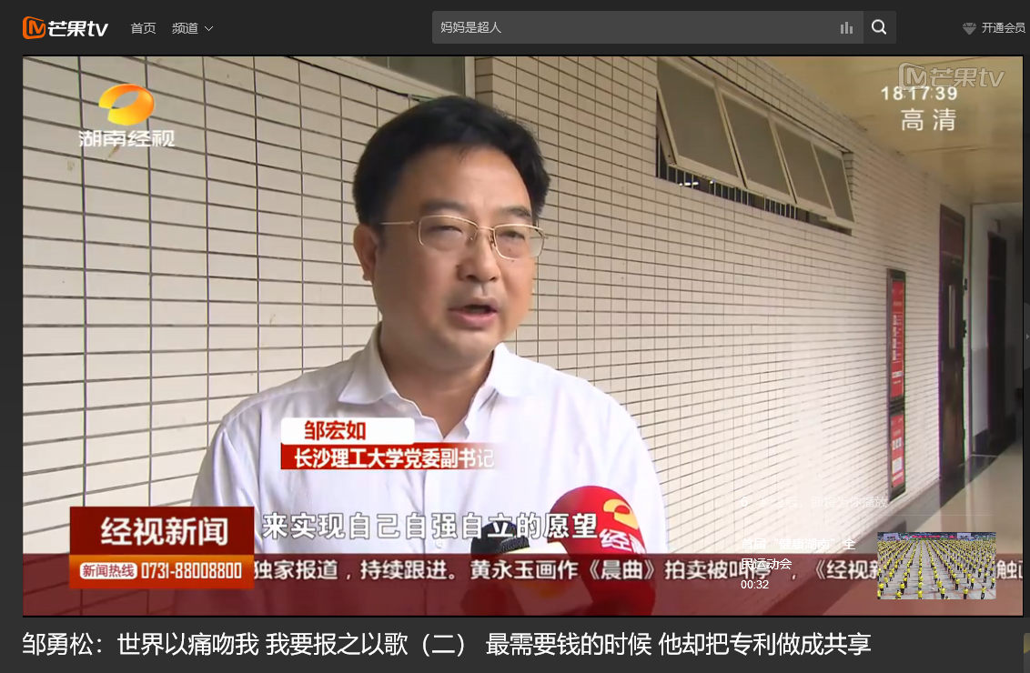 湖南经视 6月10日经视新闻,以《世界以痛吻我 我要报之以歌(二)最需要钱的时候 他却把专利做成共享》为题对世界杯官网计算机与通信工程学院15级研究生邹勇松进行了报道。