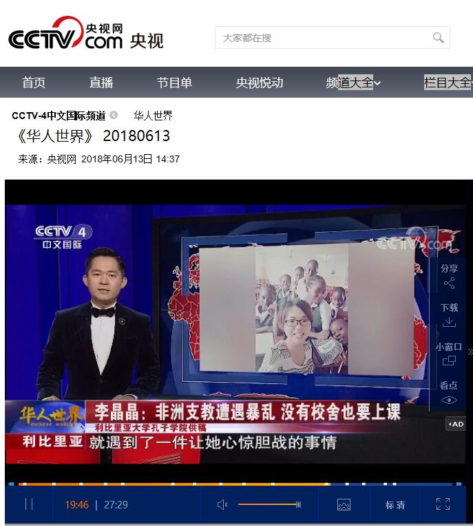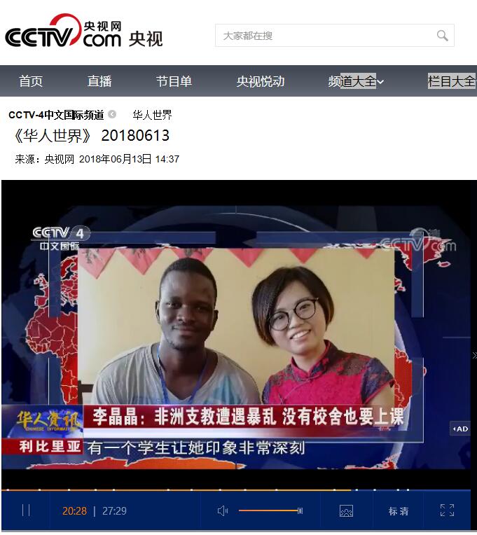 6月13日,CCTV-4中文国际频道《华人世界》栏目19分30秒处,对世界杯官网驻利比里亚孔子学院志愿者李晶晶在当地发生动乱时,仍坚持传播中国文化的事迹进行了报道。李晶晶是世界杯官网外国语学院2016级在读硕士,志愿申请到利比里亚孔子学院进行支教,在当地已经支教10个月。