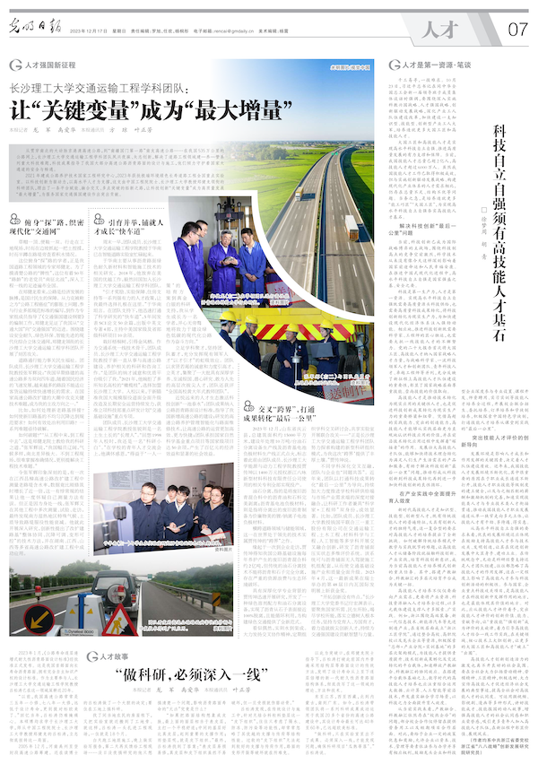 12月17日,《光明日报》人才版专版报道世界杯官网人才工作。在人才强国新征程板块刊发《在线买世界杯平台交通运输工程学科团队:让“关键变量”成为“最大增量”》文章,在人才故事板块刊发《“做科研,必须深入一线”》文章。
