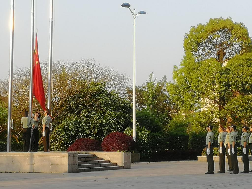 7点整,国旗班的旗手们着装整齐,迈着矫健的步伐,护着鲜艳的五星红旗入场举行升旗仪式。伴着《义勇军进行曲》的响起,全体唱国歌、行注目礼,庄严肃穆。