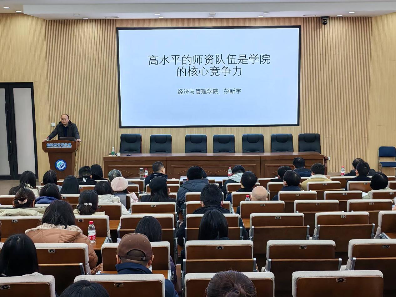 2025年1月7日下午,学院在经管大楼100报告厅召开了2024年度人事人才工作会议。学院党政班子成员、各系主任、支部书记、近五年新进教师、近五年新晋高级职称人员、2025-2026年拟申报高级职称人员近80人参加了会议。大会由彭新宇院长主持。
