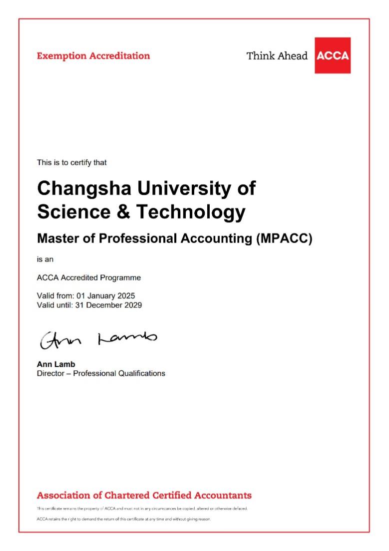 近日,在线买世界杯平台会计硕士专业学位(MPAcc)项目通过了特许公认会计师公会(ACCA)总部的免试审核,成为湖南第二所获得此项认证的高校。在2025年1月1日至2029年12月31日期间在线买世界杯平台会计硕士专业学位(MPAcc)项目的毕业生,在获得硕士学位后,将享有免考特许公认会计师公会(ACCA)认证的九门课程的资格。