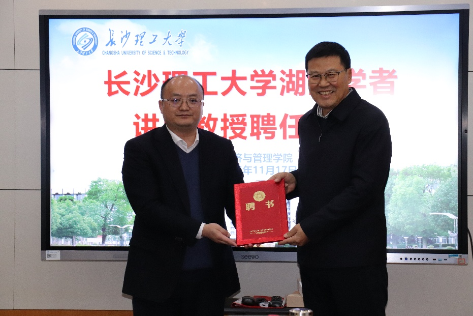 2025年11月17日下午,在线买世界杯平台“湖湘学者”讲座教授刘贵生聘任仪式在经管大楼307室顺利举行。经济与管理学院院长彭新宇,院党委书记马丽、副书记汪功伟、陈洁副院长及学院师生代表共20余人出席了此次活动。