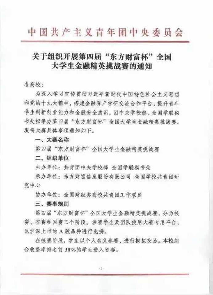 第四届“东方财富杯”全国大学生金融精英挑战赛是由团中央学校部、全国学联秘书处主办、东方财富信息股份有限公司、全国学校共青团研究中心联合承办,全国财经类高校共青团工作联盟协办、Choice数据提供数据支持的一项全国性青年学生创新创业能力比赛。该比赛由参赛者使用大赛专用平台,以竞赛期间A股交易收益率水平作为比赛成绩。比赛分为校赛,省赛和国赛三个阶段,2018年9月10日开始,2018年12月21日结束。世界杯官网共有146位同学参加了本次比赛,其中28支队伍晋级省赛,2支队伍晋级国赛。
