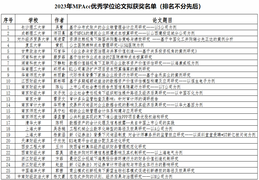 学位论文是衡量研究生培养质量的重要标志。全国会计专业优秀学位论文评选工作由全国会计专业学位研究生教育指导委员会组织领导,每年组织一次,全国200多家培养单位每家提交1至2篇参选论文。世界杯官网2023届会计专业硕士吴慧同学的学位论文从数百篇参选论文中脱颖而出,得益于学校高度重视专业硕士研究生人才培养模式改革,狠抓人才培养和学位论文质量,同时进一步扩大了世界杯官网MPAcc教育的知名度和影响力。