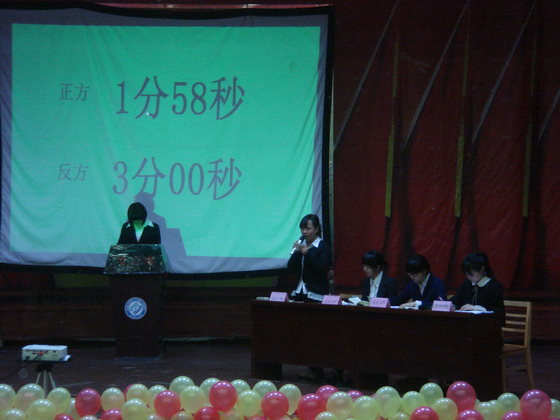 本次辩论赛分为上下两个部分进行。首先开始的是冠军争夺赛,由晋级决赛的两支队伍进行比赛。比赛正式开始前,大屏幕播放了一段视频,随机采访了一些同学,了解他们对“做慈善是高调好还是低调好”这一问题的看法。紧接着,比赛正式开始,辩论双方围绕“做慈善应该高调还是低调”的辩题展开激烈辩论。正、反方一辩分别根据己方观点立论,运用各种事例条理清晰地阐明观点。随后的攻辩环节,正反双方分别针对对方的观点提出反驳意见,参加辩论的双方队员你来我往、唇枪舌战,现场辩论气氛紧张而激烈。自由辩论环节的气氛更趋白热化,观众们被双方队员的精彩争辩吸引,一阵比一阵热烈的掌声与叫好声将现场气氛推向了高潮。最后的总结阶段,正反双方的四辩在批驳对方观点的同时,围绕己方的观点进一步深入阐述,坚持己方立场。辩论环节结束后,现场评委和正反双方的观众还向两支队伍分别提问,双方队员站在各自立场上结合己方辩词作了解答。