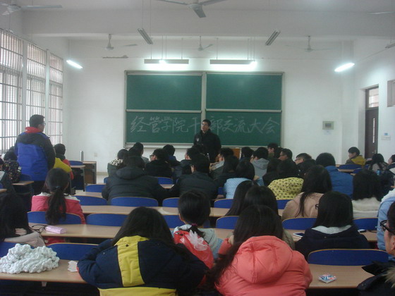 12月12日12:30,经管学院干部交流大会在文科楼D103顺利举行。经管学院第六届分团委学生会主席张经帆作为嘉宾出席了本次会议,并为大家讲授在学生工作过程中遇到的主要问题及其解决办法。第七届分团委学生会主席团陈文龙、刘宇及14级分会全体成员参加了本次会议。