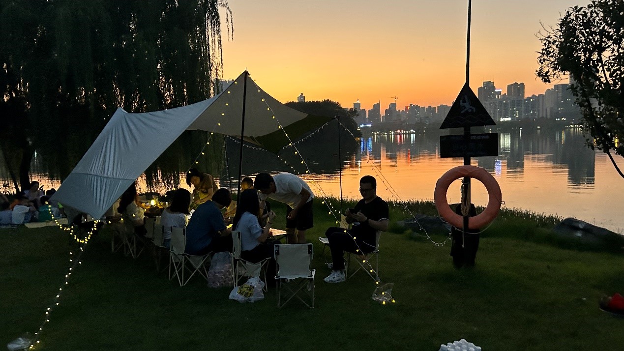 活动伊始,到达目的地已时至傍晚,走进公园,抬头是美丽的夕阳和湖中倒影的剪影,低头是郁郁葱葱的的树木,绿油油的草地上铺满树上落下的花朵,还有排列整齐的露营帐篷,小伙伴们纷纷被眼前亮丽景色吸引并拿出手机拍照打卡。