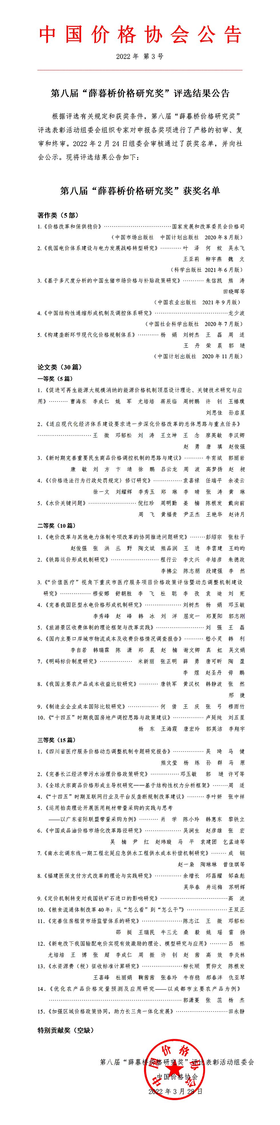 3月28日,中国价格协会官网公告,第八届“薛暮桥价格研究奖”评选表彰活动组委会审核通过了获奖名单,在线买世界杯平台经济与管理学院叶泽教授团队(叶泽、何姣、吴永飞、王亚莉、柳宇燕、魏文)著作《我国电价体系建设与电力发展战略转型研究》荣获第八届薛暮桥价格研究奖,实现了我院在该奖项领域零的突破。