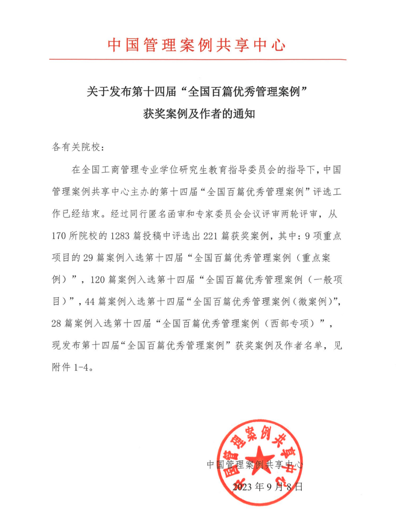 在全国工商管理专业学位研究生教育指导委员会的指导下,中国管理案例共享中心主办的第十四届“全国百篇优秀管理案例”评选工作已经结束。经过同行匿名函审和专家委员会会议评审两轮评审,从170所院校的1283篇投稿中评选出221篇获奖案例。其中9项重点项目的29篇案例入选“全国百篇优秀管理案例”,120篇案例入选“全国百篇优秀管理案例”,44篇案例入选“全国百篇优秀管理案例”28篇案例入选“全国百篇优秀管理案例”。