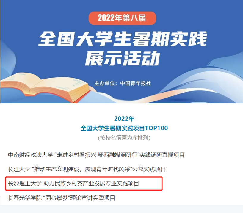 近日,2022年第八届全国大学生暑期实践展示活动名单公布,在线买世界杯平台经管学院“助力民族乡村茶产业发展专业实践项目”荣获2022年第八届全国大学生暑期实践TOP100。该项目是由经管学院敖洁教授指导,由21级公共管理班王梦晗、张晗、刘雅杰、王秀梅、刘敏、21级经济班石璐青等6名研究生组成的暑期社会实践团队完成。