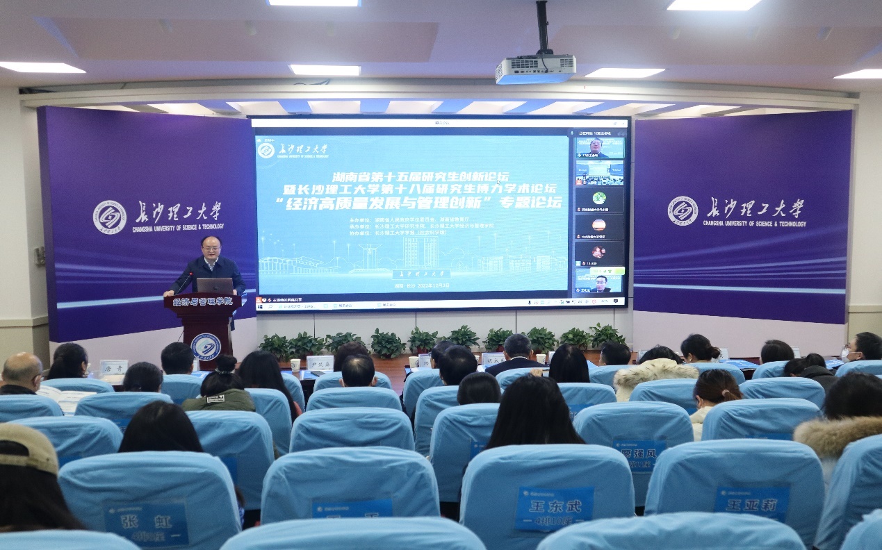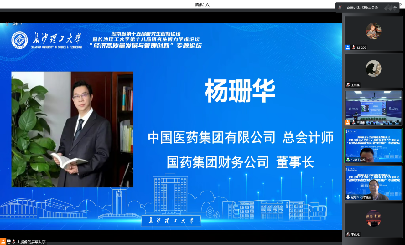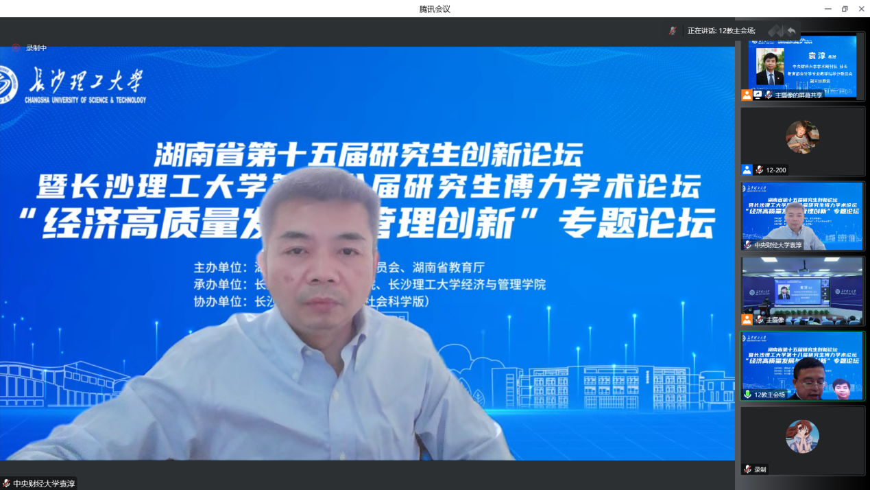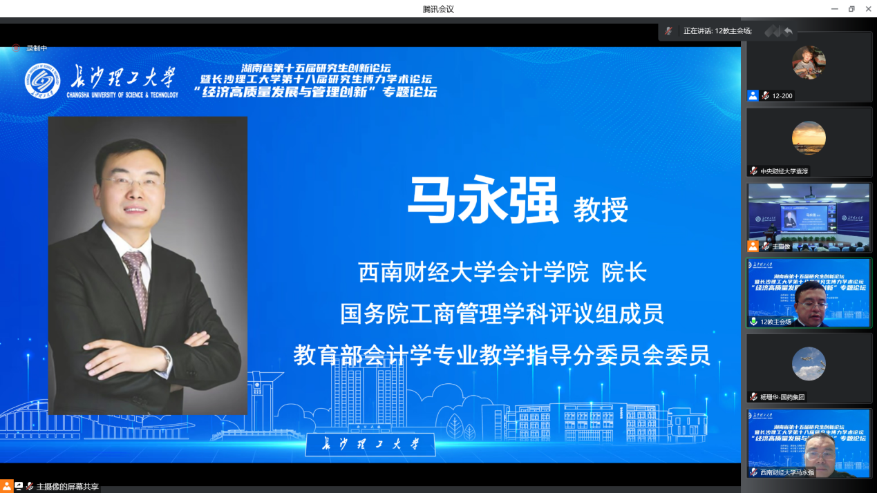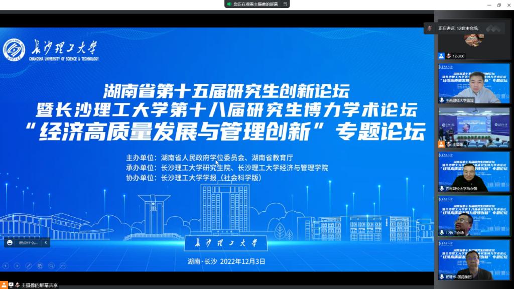 12月3日,湖南省第十五届研究生创新论坛——“经济高质量发展与管理创新”专题论坛暨在线买世界杯平台第十八届研究生博力学术论坛在在线买世界杯平台金盆岭校区成功举办。此次论坛由湖南省人民政府学位委员会、湖南省教育厅主办,在线买世界杯平台研究生院、在线买世界杯平台经管学院承办,在线买世界杯平台学报(社会科学版)协办,采用线上线下相结合的方式。论坛邀请了中国人民大学商学院王化成教授、中国医药集团有限公司杨珊华总会计师、西南财经大学会计学院院长马永强教授、中央财经大学学术期刊社社长袁淳教授进行主题报告,在线买世界杯平台副校长胡永乐教授、研究生院院长杨华峰教授、城南学院院长赵华教授、研究生院副院长尹筑嘉教授、在线买世界杯平台学报(社会科学版)常务副主编邓英副教授、经管学院全体院领导、研究生导师以及省内高校300余名研究生参加了此次论坛。