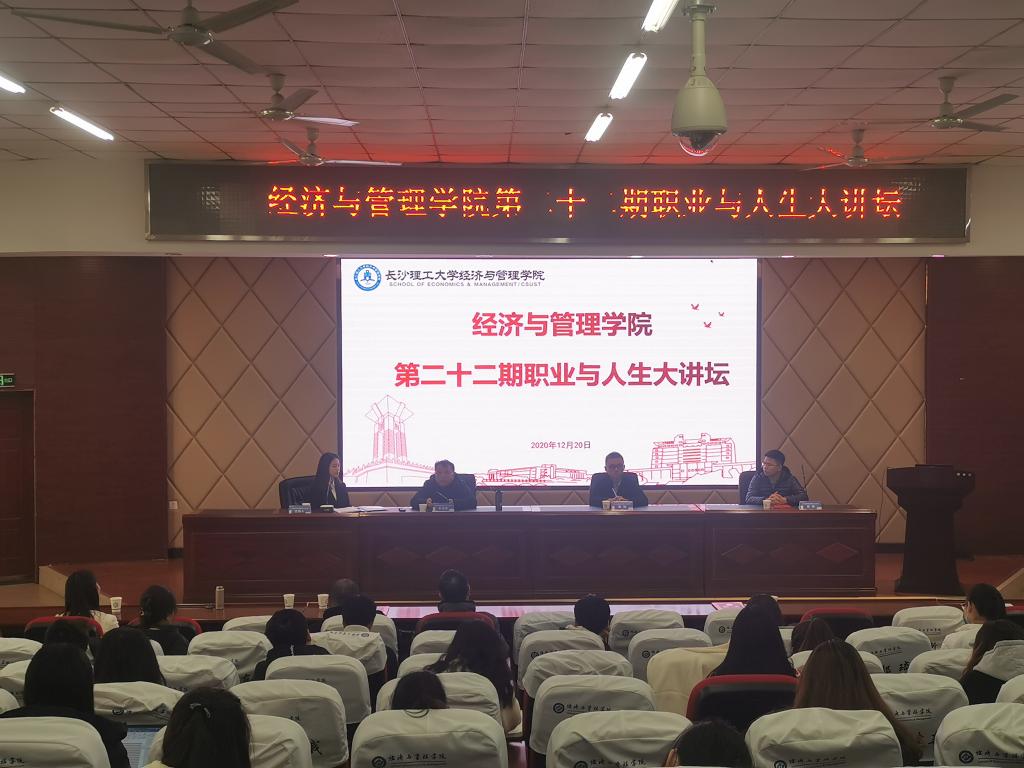 12月20日下午,第二十二期职业与人生大讲坛在云塘校区文科楼A200举行。本次讲坛邀请了经管学院84级财会校友、澧水公司总经理王志宏,02级会计校友、湖南数魔网络科技有限公司副总裁黄琼以及13级国贸校友、中交地产股份有限公司投资经理郭琳为主讲嘉宾,00级国贸校友、湖南联智科技股份有限公司总助罗青兰和07级会计校友、华银电力财务管理部资金处主管卜旭到场交流,校友中心主任李伟、院党委副书记唐青、关工委副主任陈均杰和学工办周路路、王宝宝老师和150余名经管学子参加本次活动。