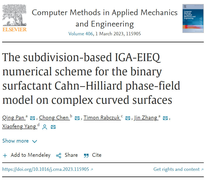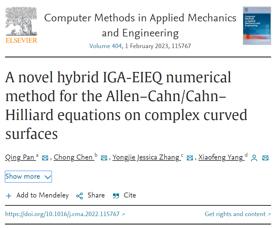 近日,我院潘青教授以第一作者,在线买世界杯平台为第一单位在计算力学领域国际顶级期刊《Computer Methods in Applied Mechanics and Engineering》(简称《CMAME》)发表了两篇论文。题目分别为“A novel hybrid IGA-EIEQ numerical method for the Allen–Cahn/Cahn–Hilliard equations on complex curved surfaces” 和“The subdivision-based IGA-EIEQ numerical scheme for the binary surfactant Cahn–Hilliard phase-field model on complex curved surfaces”。研究成果是世界杯官网计通学院智能化软件工程研究团队与国际著名计算力学专家欧洲科学院院士德国魏玛-包豪斯大学Timon Rabczuk教授结构力学课题组合作完成的高水平学术论文。