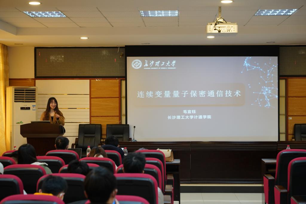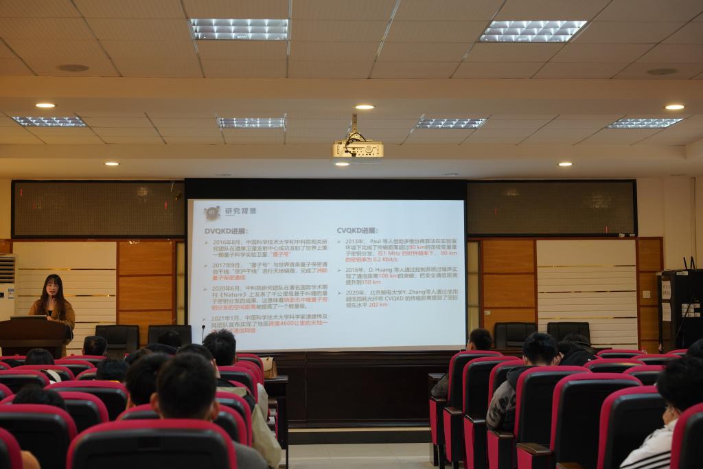 论坛第三部分,校内年轻博士发表学术报告。毕业于中南大学交通信息工程及控制专业的毛宜钰老师,针对量子密钥分发研究背景、连续变量量子密钥分发技术、连续变量量子密钥分发的实际安全性等问题发表报告。