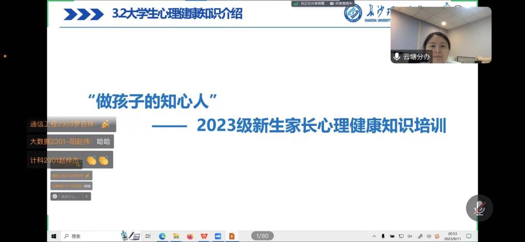 9月11日晚,计通学院通过腾讯会议线上直播的方式举行2023级新生及家长见面会,学院党委书记孔伟红、院长张锦、党委副书记王觊婧出席本次会议,学工办全体老师及627名新生及家长参加此次会议。