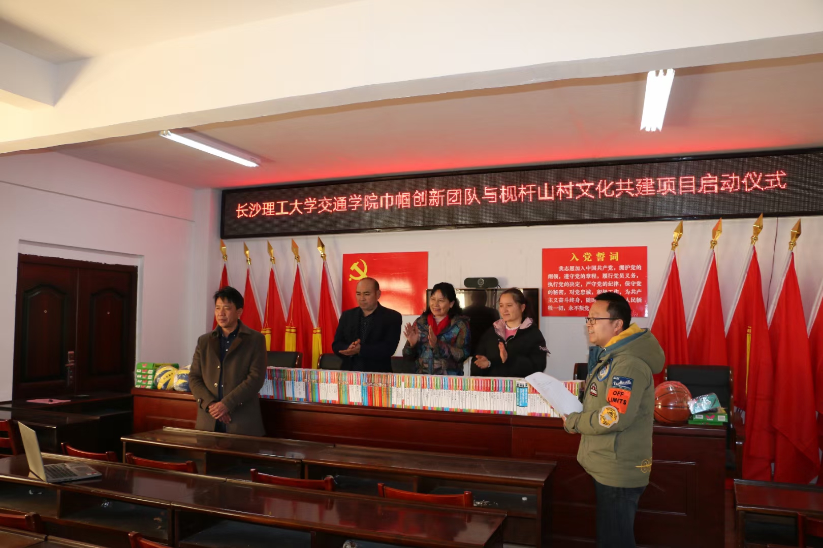 下午3点,交通学院巾帼创新团队与枧杆山村文化共建项目启动仪式在枧杆山村村部一楼会议室举行,孔伟红书记代表交通学院向枧杆山村捐赠了图书、体育器材等物资,枧杆山村新一届村支书兼村主任杨忠祥对交通学院的捐赠表示感谢,宋刘斌队长对枧杆山村的文化建设进行了全面介绍,巾帼创新团队负责人金娇博士对开展文化共建活动的初衷以及以后活动开展的一些思路进行了说明。最后孔伟红书记进行总结讲话,她表示捐赠文体物资只是文化共建项目的第一步,交通学院巾帼创新团队都是由女博士组成,具有丰富的文化知识,可以通过开展文化讲座、一对一帮扶等方式为枧杆山村的文化建设贡献智慧和力量。她强调,开展校地文化共建项目意义重大,农村是乡村文化建设的出题人,而高校要做好乡村文化建设的答卷人,脱贫攻坚之后将全面开启乡村振兴,乡村振兴的一个重要的任务是乡村文化的振兴,开展校地文化共建活动,可以充分发挥高校的文化资源优势助力乡村振兴,也可以让乡村的文化需求反推高校文化事业的发展。(文/彭怡峰 图/杨晓峰 审/孔伟红)