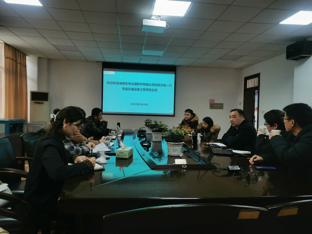 2022年1月18日上午,湖南东华云通软件有限公司总裁邱雯一行5人来交通运输工程学院交流,院党委委员王正武教授及部分交通工程专业老师参与交流座谈。