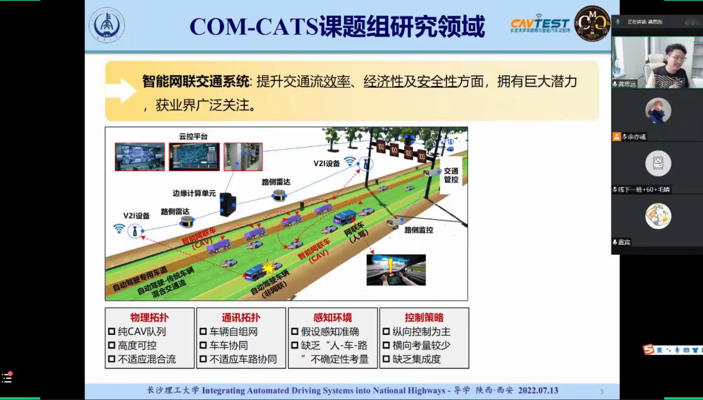 Pro.Ma从各个方面介绍自动驾驶系统与国家公路系统的集成。首先,Pro.Ma将从交通系统规划的角度来分析当自动驾驶车辆引入人类交通流时,对需求和供应有什么影响。随后,Pro.Ma从技术的角度讨论互联合作的自动驾驶系统和智能基础设施,其可以协作改善交通系统的管理和运营,层层递进引出了其团队基于CDA的研究成果。讲座的最后,Pro.Ma与暑期学校的师生进行了深入交流,详细回答了师生关注的智慧交通和自动驾驶等问题。同学们表示,通过Pro.Ma的学术讲座增进了对自动驾驶系统的了解,扩宽了学术视野和科研思路。