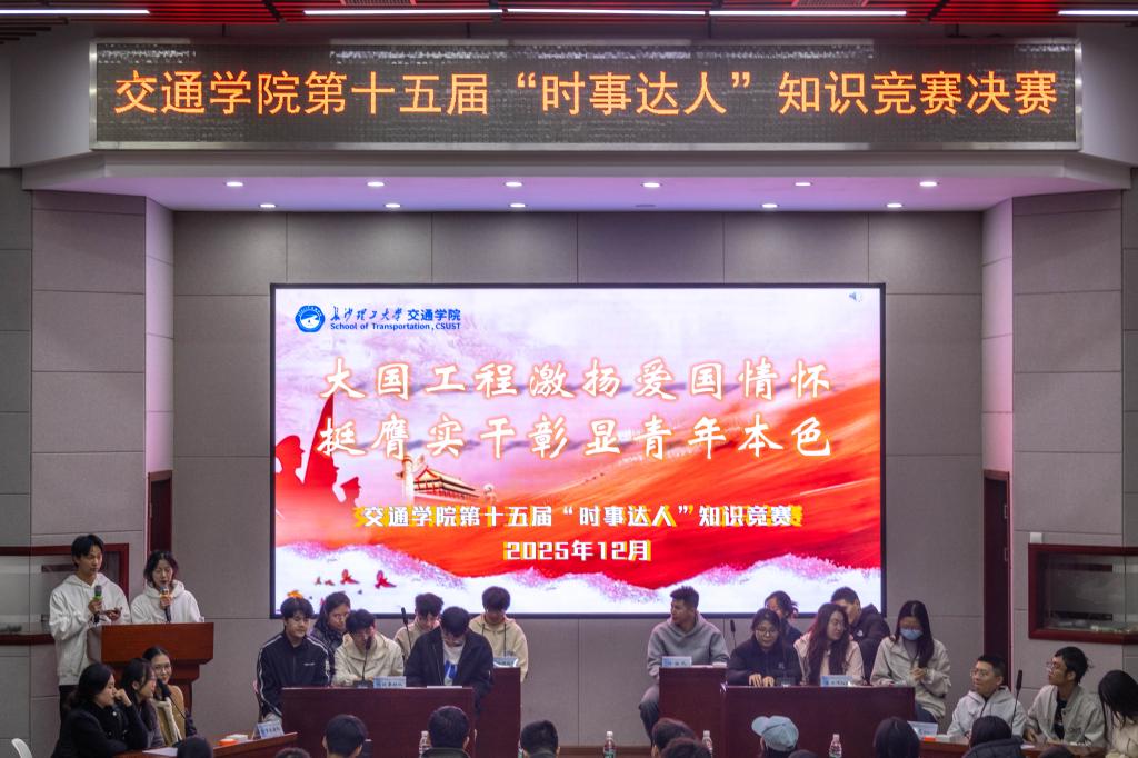 12月9日晚,在线买世界杯平台交通学院第十五届“时事达人”知识竞赛决赛在云塘工二B301报告厅落下帷幕。本次竞赛以“大国工程激扬爱国情怀,挺膺实干彰显青年本色”为主题,吸引百余名师生到场观赛,活动现场气氛热烈。