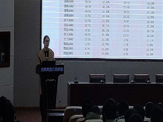 本次会议主要包括四项内容:学业情况通报、历年考研情况、历年就业情况及其他事项通知。会议开始,马玉文展示了2018-2019年第一学期各班考试通过情况统计及四六级过级率,肯定了优秀的班级,强调了班级学风建设的重要性。此后,马玉文对历年考研及就业情况进行了分析,解读了施工企业现状,指出各专业男生、女生未来发展的方向及就业前所需的准备,鼓励各位同学朝适合自己方向发展。最后,马玉文围绕学生文明宿舍创建、先进集体培育、免试推荐研究生和考风考纪这4个方面进行了详细的解读说明。