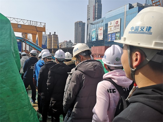 交流会结束后,中交一公局项目部成员带领交通青年前往长沙地铁六号线项目一工区进行现场参观学习。现场的技术工程人员详细介绍了目前的地铁项目进度和现场的工程器械。其中,学生代表对我国独立研发制造的土压平衡盾构机产生了浓厚的兴趣,以不同专业的角度对现场的技术人员提出问题。