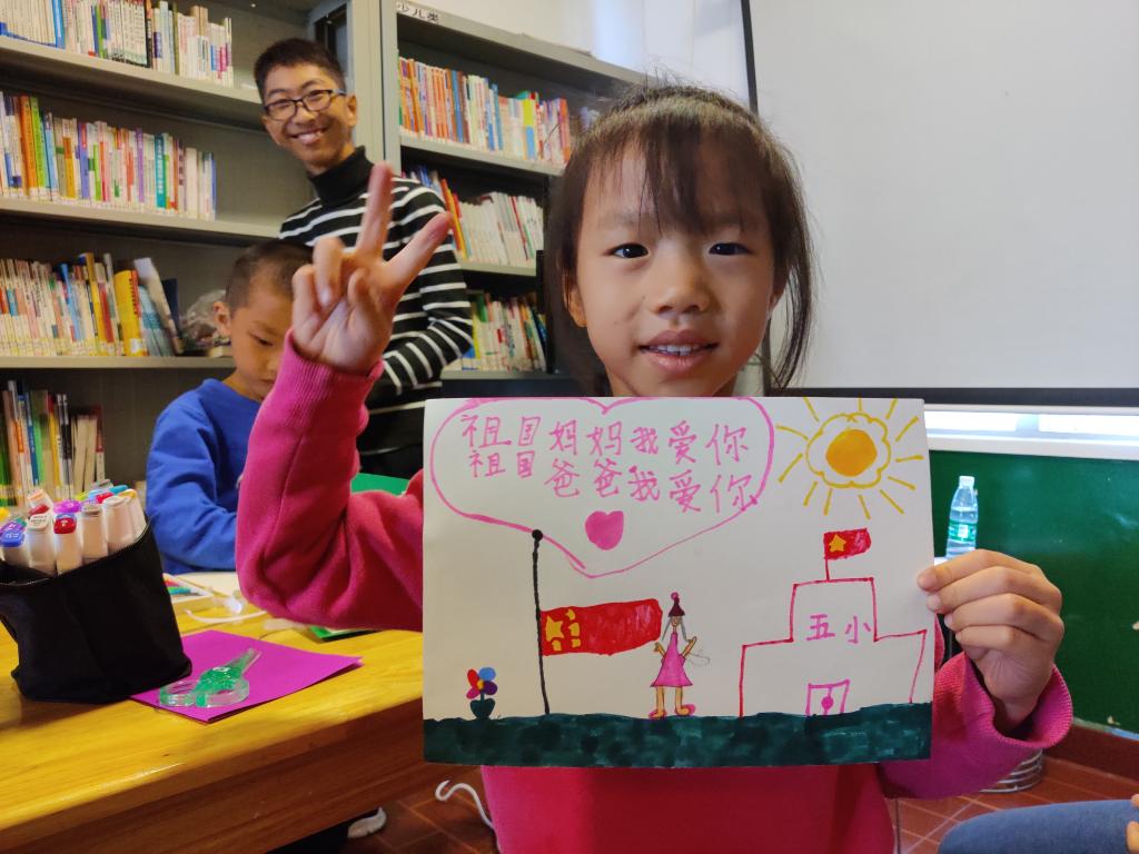 首先,张美平开展班会课,为孩子们介绍新的志愿者,让孩子们分享在分别的这段时间中记忆犹新的的故事。课间,志愿者与孩子们进行“别踩我的气球”小游戏,通过游戏的方式更快地拉近志愿者与孩子们之间的距离。最后,张海新为孩子们带来手工课,让孩子们充分发挥想象力去创作给祖国母亲的贺卡。