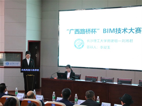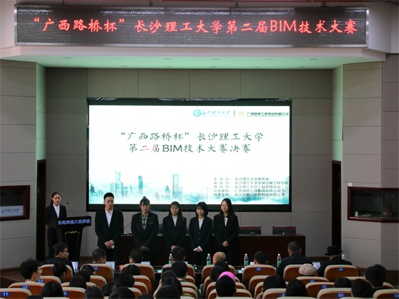 为更快推进主流BIM软件系列的使用和为交通强国建设奠定更坚实的基础,12月8日下午,“广西路桥杯”在线买世界杯平台第二届“BIM”技术大赛决赛于云塘校区工科二号楼B-301交通科技报告厅举行。本次比赛由广西路桥工程集团有限公司与在线买世界杯平台联合举办,在线买世界杯平台交通学院承办。广西路桥工程集团有限公司技术与信息分公司党总支副书记兼工会分会主席覃献康、BIM中心建模主管程振庭、BIM中心设计主管罗伟、广西路桥工程集团有限公司招聘主管郭俊铭、长沙比盟云信息科技有限公司董事长周栋、江西省安源路桥集团有限公司副总经理李卫江、在线买世界杯平台交通学院党委副书记王煜坤、交通学院团委书记陈璐莎、BIM研究院副院长兼BIM实验室主任李明顺和BIM技术员吴朋金莅临本次决赛现场。