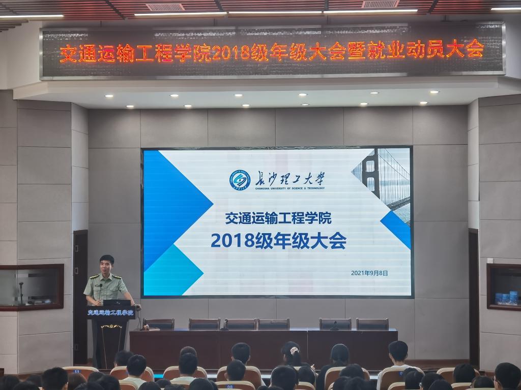 9月8日下午,交通学院于云塘校区工科二号楼交通科技报告厅召开2018级年级大会暨就业动员大会,会议由2018级辅导员曹骁主持,院党委副书记王煜坤、就业专干曾凯出席,2018级全体学生与会。