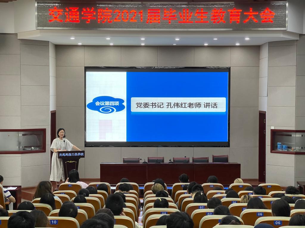 6月10日,交通学院2021届毕业生教育大会在工科二号楼交通科技报告厅召开,交通学院2021届毕业生参加,学院党委书记孔伟红、就业辅导员李特超出席,会议由毕业生辅导员肖敏强主持。