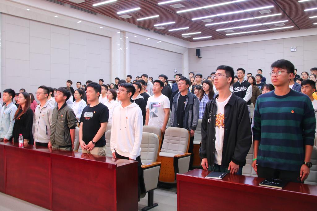 在授徽仪式中,全场起立迎党旗,奏唱“国际歌”,由学院教师党员代表、各支部支委为新发展党员授徽,并宣读入党誓词。