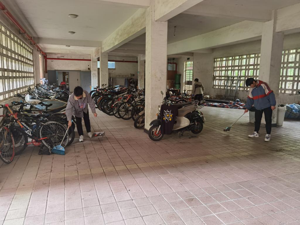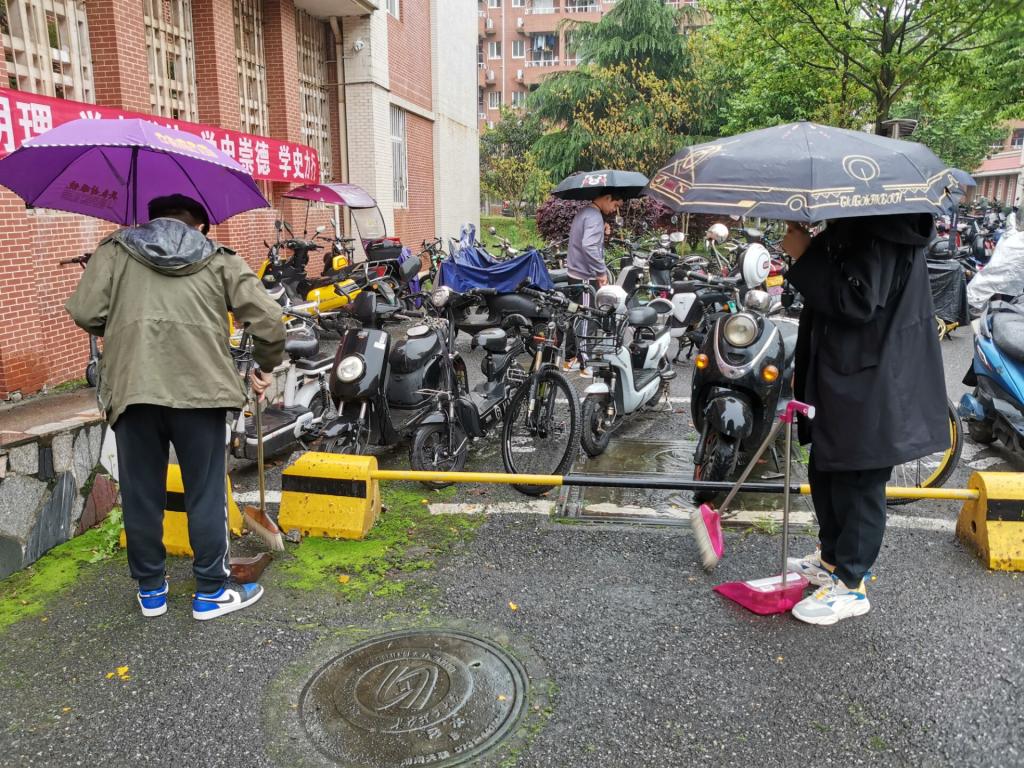 义务劳动期间,40余名义工分别对行健轩三栋和敏行轩的前坪、周边道路及内外草坪垃圾进行清理,规整了单车棚内自行车,打扫了楼道卫生,清除了走道、墙面、宣传栏、通知公告栏的小广告和牛皮癣……卫生大扫除结束后,行健轩三栋和敏行轩内外环境焕然一新。同时为了确保宿舍楼栋周边道路畅通,避免出现消防通道堵塞,工作人员还对宿舍楼下非机动车进行引导,使其有序停放在规定区域内。