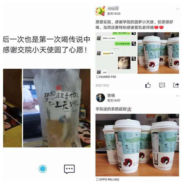 “我们想喝网红饮品茶颜悦色!”这张心愿卡的署名是宿舍号。该宿舍的周烨说,“身在长沙还从来没喝过茶颜悦色,这是我大学四年中的第一杯,很有可能以后就再难喝到了。”为此,学工办老师们利用午休的时间,来到学校外面的商场为宿舍的同学集体购买了饮品。周烨和宿舍同学一起品尝了茶颜悦色,感慨道,“奶茶很好喝,很暖心!感谢学院为我实现了心愿”。