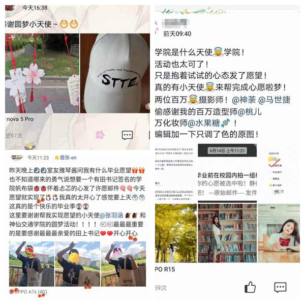 学生的每一个心愿,我们都应该全力以赴。学院收集到心愿后,立即组建了由摄影师、化妆师、道具师构成的专业团队,为学生做造型、找场景,上门送货服务。拍摄结束后,赵雅琴同学第一时间在朋友圈、QQ空间中发布了自己的写真大片,并配上勒这段文字,“交通学院简直就是天使学院!圆梦活动太可了!本来只是抱着试试的心态发了愿望,结果真的有小天使来帮忙完成心愿啦,感谢!感谢!感谢!”