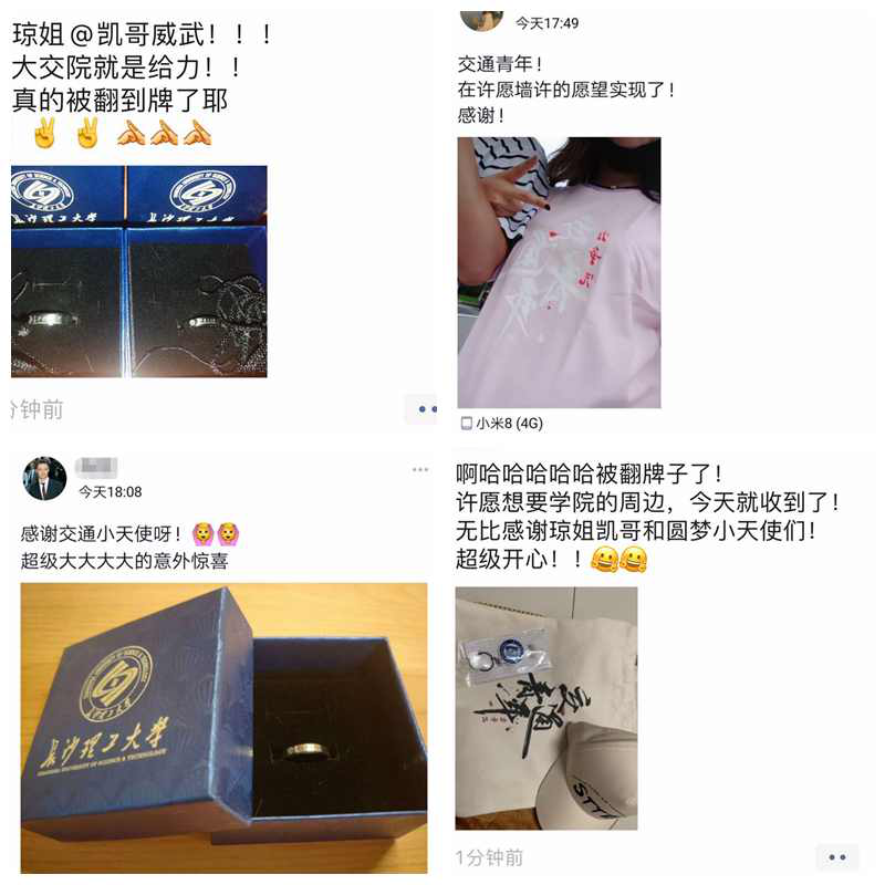 “这个夏天,不留遗憾”圆梦活动自6月初开展以来,学院收到了同学们的心愿与祝福卡共计200余张,除了“演唱会”“写真照”“茶颜悦色”等心愿外,不少同学对学院独创的交通青年帽子、文化衫、周边等系列文创产品情有独钟。与此同时,学院还开展了毕业季专访、“你说我听”毕业分享以及回忆视频“三部曲”等特色活动,全力营造交通学院浓厚毕业氛围,传承交通青年优秀文化。