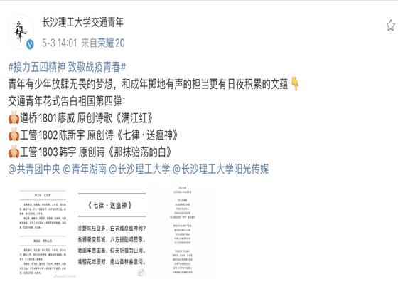通过此次五四专题活动,交通青年们用自己的方式向抗疫战士致敬,向祖国深情告白,增强了肩负实现中华民族伟大复兴的使命感,在传承五四精神的同时深化了心中拳拳爱国情。